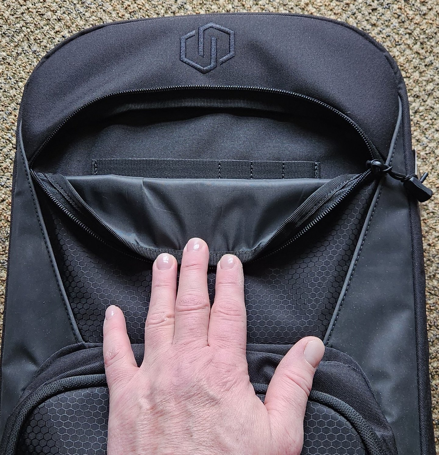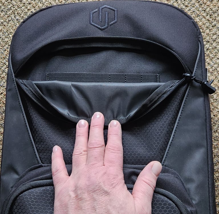 Behind the front main pocket is a deep hidden pocket with a hook panel for accessories. This pocket is great for concealing additional tools (wink).