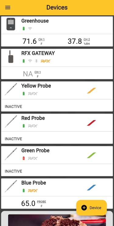 The Thermoworks app allows you to configure and manage the RFX system and other Thermoworks products. In this screenshot of the app, we also have the Thermoworks Node (https://www.thermoworks.com/node/) for our greenhouse, which works great.