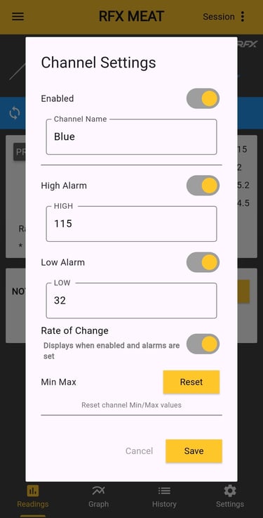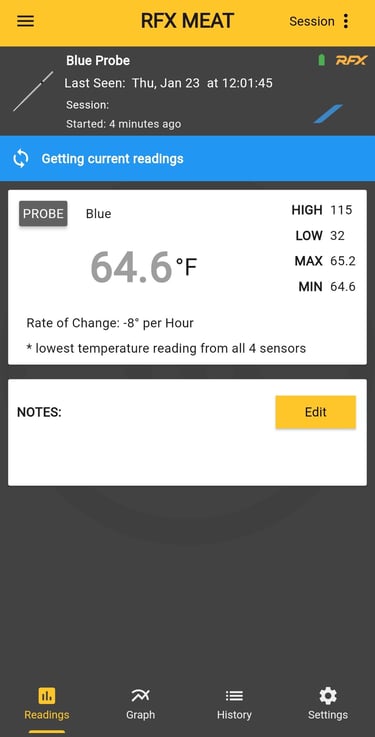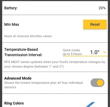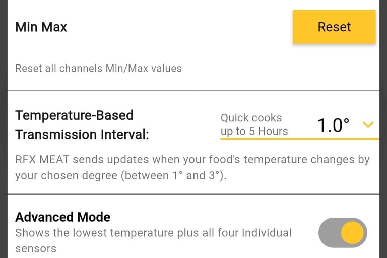 The app is fundamental and does a good job. With the RFX probes, you can set high and low-temperature alerts and monitor current temperatures—more on the Thermoworks app below.