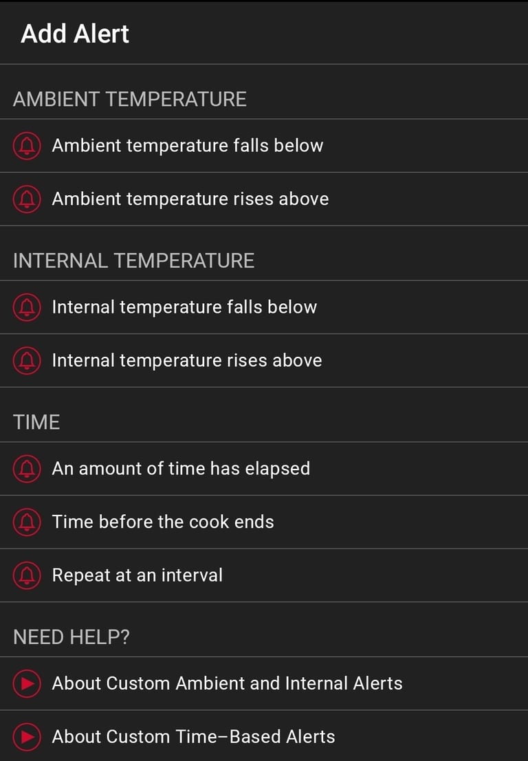 The Thermoworks app allows you to set high- and low-temperature alerts, but not others.